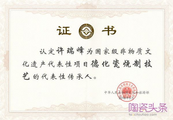 许氏瓷塑第六代传人、中国陶瓷艺术大师、非物质文化遗产(德化瓷烧制技艺)国家级传承人、全国青年优秀工艺美术家、福建省工艺美术大师、高级工艺美术师、泉州市优秀拔尖人才、福建省商学院,泉州市信息工程学院、泉州市工艺美术学院讲座教授、福建省工艺美术协会副会长、福建省陶瓷工业协会副会长、泉州市工艺美术协会副会长、德化县政协常委……这些头衔,都是社会各界对许瑞峰的赞誉。