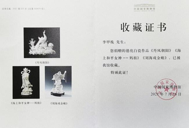 近日,李甲栈大师的三件白瓷作品:《丹凤朝阳》、《刘海戏金蟾》、《海上和平女神-妈祖》,均被中国国家博物馆(简称:国博)纳入馆藏。