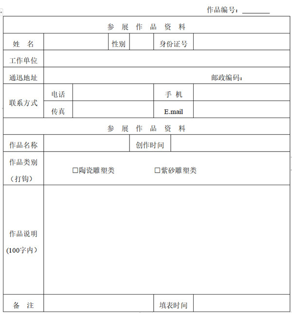1.每件(套)作品需单独填写参评表;2.每件(套)作品的作者一般不超过2人;3.寄送表格时需附作品高像素照片;4.此表请于2020年5月22日前发送至157256839@qq.com,实物作品于2020年5月28日送到德化县陶瓷博物馆二楼,逾期不再接收。