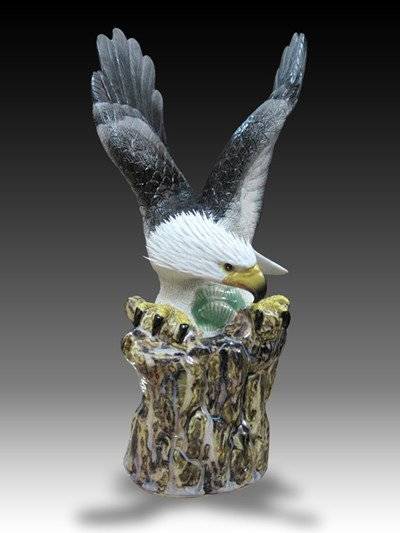 这里不是浩瀚荒漠,也不是高山草原;这里没有参天古木,也没有碧海蓝天;然而却有鹰——形态迥异、羽色不同的鹰——瓷鹰。它们或敛翅而栖,或展翼而飞,或昂首摩云,或俯视擒物。看那瓷鹰,取之耸身待起的瞬间姿态,嘴钳剑戟,爪握刀锥,那状如猢狲的眼睛侧目而视,分明透出机警、敏锐的光亮。整个造型刀法细腻传神。其线条流感中隐藏着无穷的韵律,活现出杜甫诗中“竦身思狡兔,侧目似愁胡”的意境。这就是中国陶瓷艺术大师聂乐春的鹰世界。