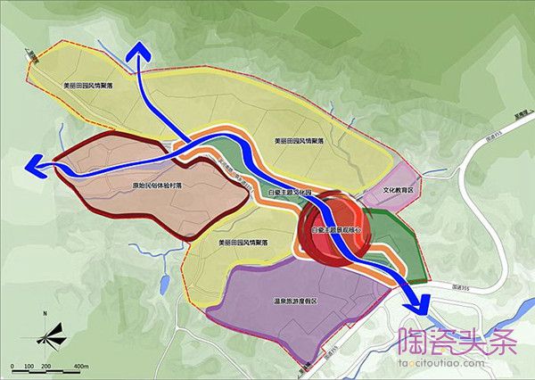 根据规划,德化白瓷小镇项目位于德化县朱紫-蕉溪片区,主要沿蕉溪两侧展开,东临国道355,南、北以山体为界,西与潘祠村相邻,为南北两个远景发展片区之一。该片区被定位为山水、生态、休闲片区,产业发展重心在休闲度假、文化体验等绿色产业,与良好的生态环境和谐发展。项目规划范围244.04公顷(3660.63亩),其中建设用地140.48公顷(2107.20亩),规划建设内容含市政配套、安置房、教育文化公共服务设施和温泉旅游商业开发等。片区分三期规划建设,一期:迎宾大道、温泉旅游度假区、陶瓷展示中心及部分生态居住区;二期:沿滨河北路的生态居住区、白瓷主题文化公园;三期:基地西侧部分生态居住区、原始民俗体验村落、文化教育区。