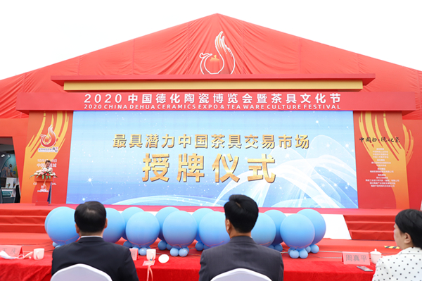 由中国陶瓷工业协会、中国茶叶流通协会、中国工艺美术学会主办,德化县陶瓷发展委员会、中国茶具城承办的2020中国德化陶瓷博览会暨茶具文化节于10月17~19日在瓷都德化隆重举办。作为开幕式的重要环节,“最具潜力中国茶具交易市场”授牌仪式在中国茶具城同时举行。