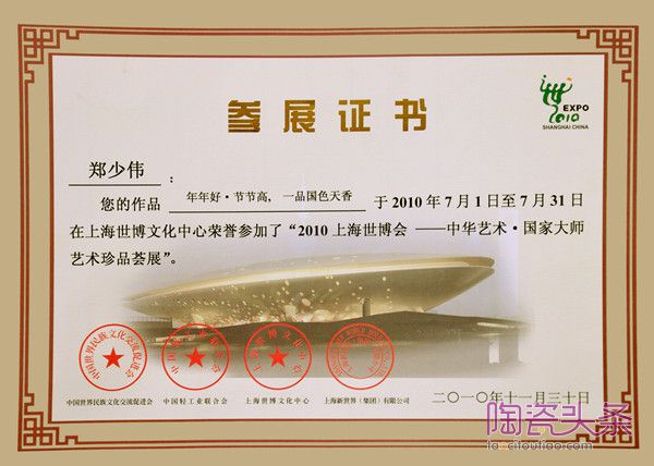 《年年好,节节高》、《一品国色天香》于2010年7月1日至7月31日在上海世博文化中心荣誉参加了“2010上海世博会——中华艺术·国家大师艺术珍品荟展”;