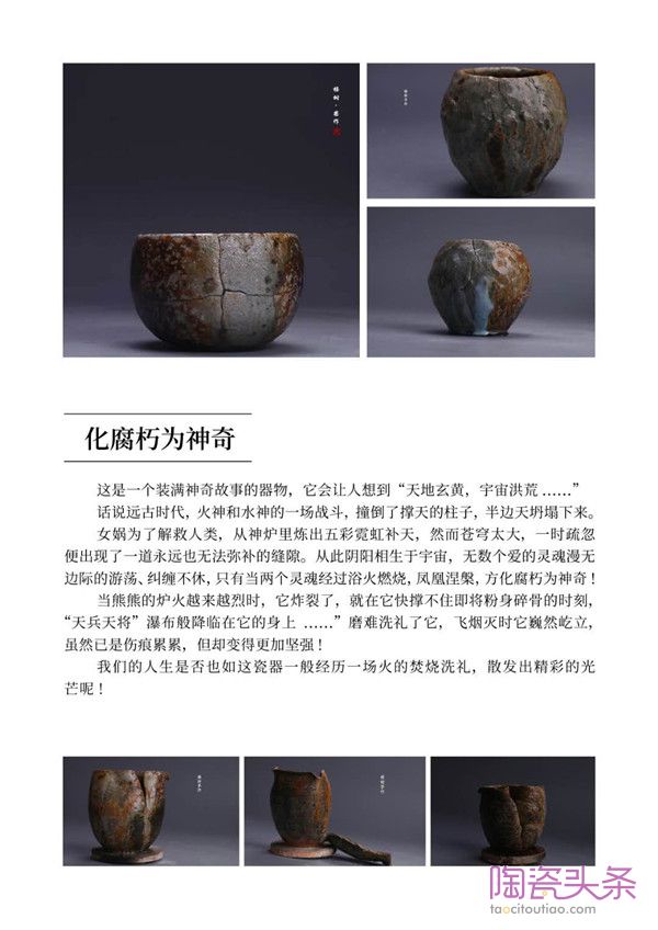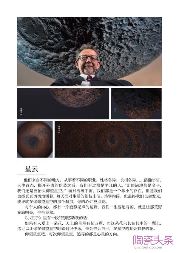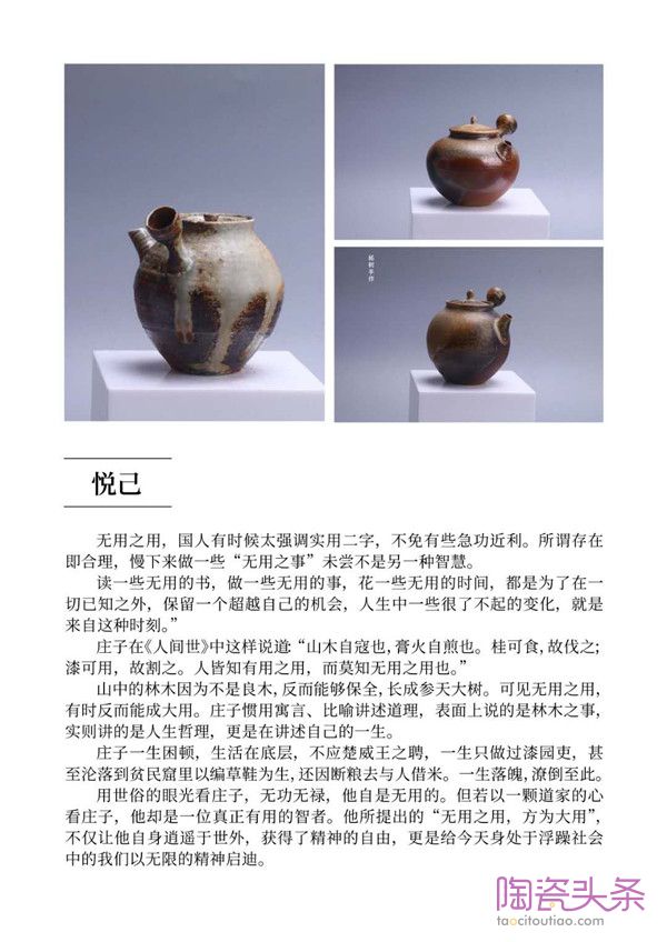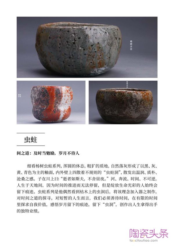 杨树解释道,现代柴烧陶艺除了是一种古老的烧瓷技艺之外,它还是表现创作者内心世界的情感语言。因此,纯粹的技艺展示是不够的,他还需为它们赋予灵魂。所以,杨树巧妙的构思了十个系列的思想主题,如《悦己》、《虫蛀》、《星云》、《天书》等,它们都是杨树在与外界的交融碰撞中,产生的对世界观、人生观、价值观的独有思考。