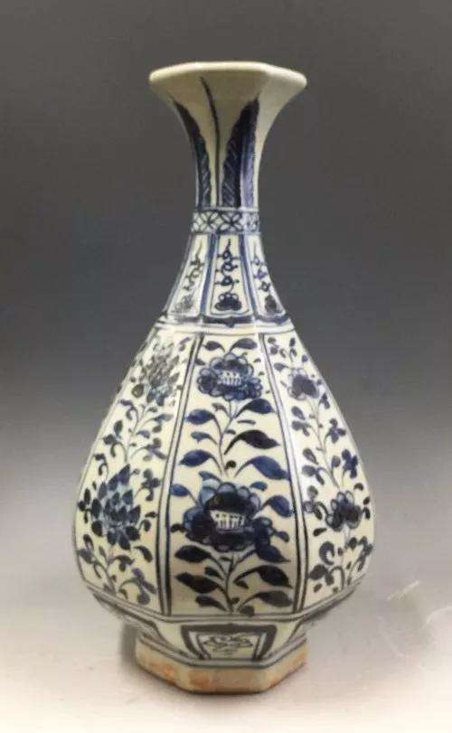 八棱器曾被普遍认为系仿自西亚银器,不过亦有专家表示,其产生与佛教有关。《大日经疏》说曼荼罗始转于东方,末至西北,为八方,意即佛法遍及周围各地,普渡众生。元代以藏传佛教为国教,朝廷笃信佛法,影响极大,故元代瓷器中有相当大的一部分为八棱(也称八角)器物。例如文中这件将于9月28日亮相香港荣盛国际精品拍卖会的青花花卉纹八棱玉壶春瓶,是典型的元青花八棱器型,器身作八棱形,胎体厚重,釉色洁白细腻,青花呈色翠蓝,色浓处可见铁锈斑和锡光斑,底足火石红明显。颈部绘制有蕉叶纹,叶片根茎纹路清晰鲜明;腹部各个棱面绘制有折枝花卉纹,叶茎婀娜,花瓣柔美多姿,构图丰满,层次多而不乱,画工潇洒,颇具中国传统水墨画韵味,整器沧桑古朴,且造型挺拔俊秀,规整秀丽,值得收藏。