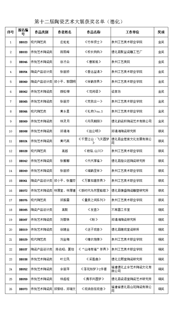 附表:第十二届陶瓷艺术大展获奖名单(德化)