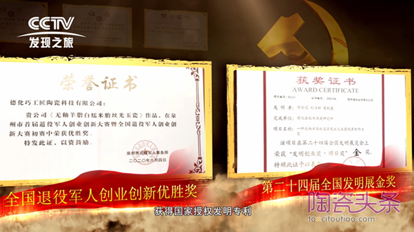 2021年7月30日CCTV发现之旅频道匠心精神系列栏目播出退役军人陈金通创新创业发明“羊脂白丝光玉瓷”的纪录片。