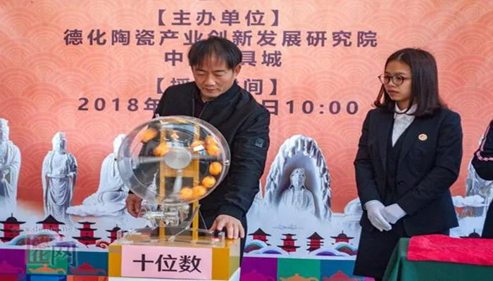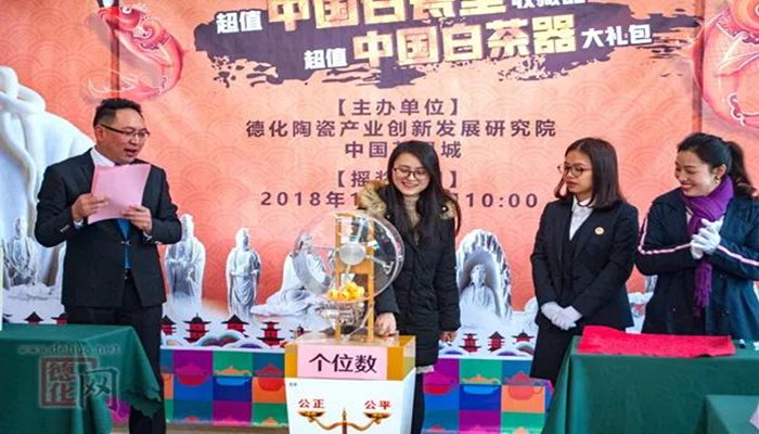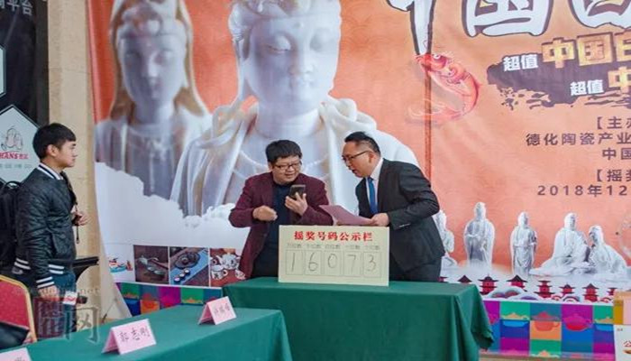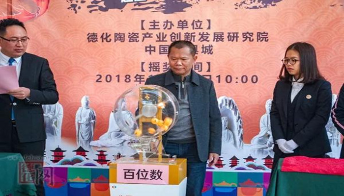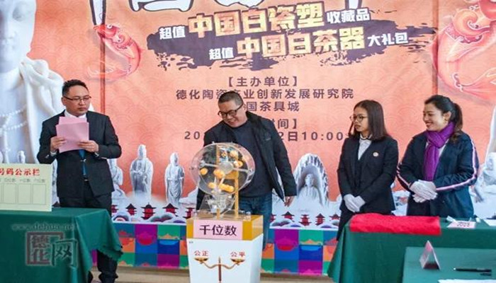 整个活动现场在保证公平公正的前提下,由中国陶瓷艺术大师许瑞峰、德化县收藏家协会秘书长郭志刚、中国茶具城颜宝敬、祥云文化总经理郭金碧、中瓷网谢玉丽5位嘉宾按照万位数、千位数、百位数、十位数、个位数进行顺序摇号。