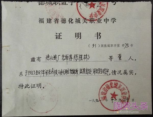 四年的教书时间里,陈老先生培育了至少上百位的学生,他们中有被评为中国工艺美术大师的赖礼同等,福建省工艺美术大师的林建胜、林禄扬、陈武聪等,从事陶瓷专业教育工作的曾映雪、苏大昕、陈武鹏等,为德化陶瓷人才的培养做出了积极贡献。