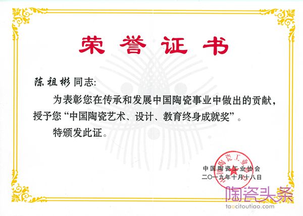 2019年,在得知陈老先生的事迹后,福建省陶瓷行业协会会长陈建新主动推荐陈老先生参评,由中国陶瓷工业协会授予的“中国陶瓷艺术、设计、教育终身成就奖”荣誉称号。儿子陈武聪特意开车带父亲前往宜兴领奖。该荣誉在德化也仅有中国陶瓷艺术大师邱双炯一位获得。儿子陈武聪表示,这是父亲六十四年在陶瓷雕塑领域默默耕耘的成果,是实至名归的荣誉。