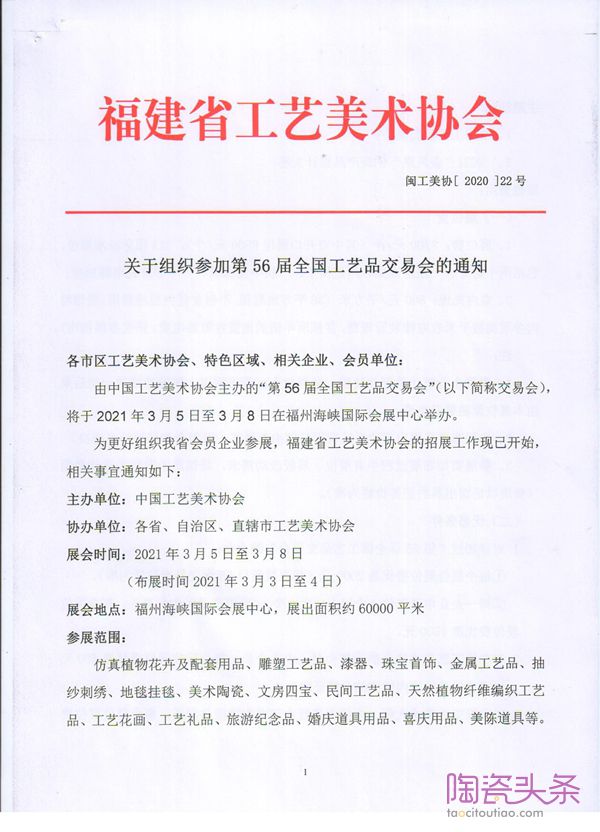 文章摘要:关于组织参加第56届全国工艺品交易会的通知