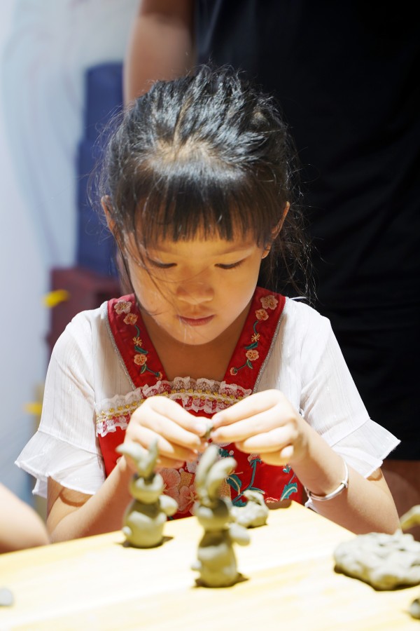 现场,郑忠辉老师一边讲解德化瓷塑制作工艺与文化知识,一边带领小朋友们捏制小兔子。通过分步骤教学,小朋友们的泥塑作品逐渐成型,一件件可爱的小泥兔很快就在小朋友们的手中产生。郑忠辉老师还不时对小朋友们进行指导,启发他们的创作乐趣,认识手作的魅力。