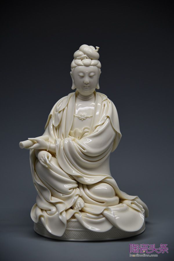 初次尝试德化白瓷雕塑创作时,黄明玉感觉既熟悉又陌生。熟悉的是,雕塑万变不离其宗。不论是陶瓷雕塑,还是树脂、玻璃等材质的雕塑,其工艺技法和创作要领都是相通的。在回德化之前,黄明玉和庄少卿在深圳从事了十几年的雕塑创作,对雕塑创作可以说是驾轻就熟。但陌生的是,德化陶瓷雕塑有其特有的创作风格和烧成技艺,其中以仿何朝宗的观音造像最为经典,但它的衣纹曲线、造像比例、结构设计的精髓不是任何人都能领会得到。“一开始做仿何作品,觉得很难看懂。”黄明玉说道。