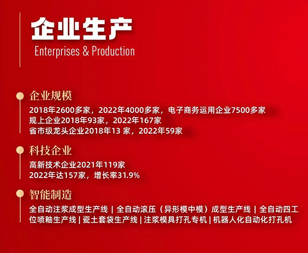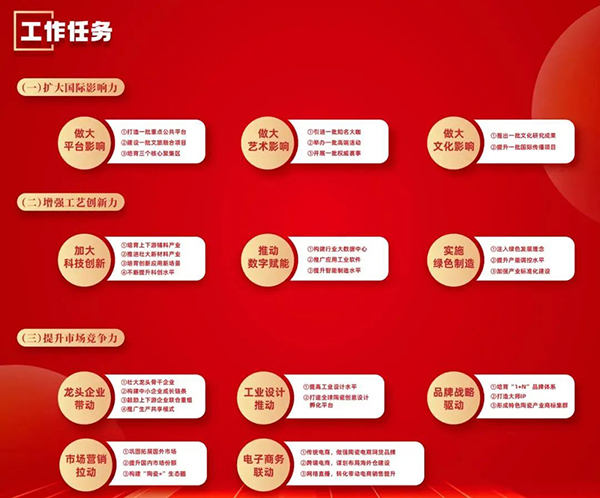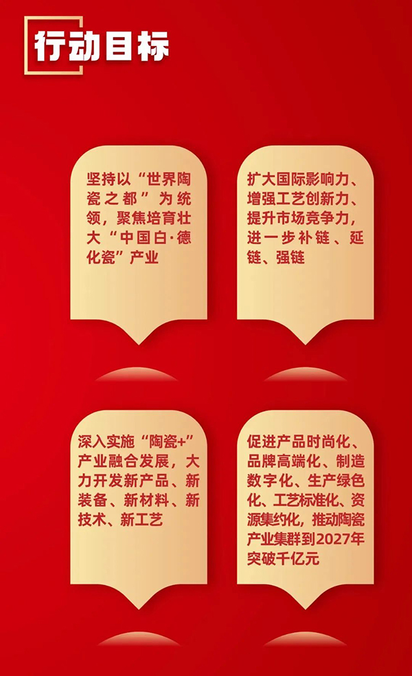 陶瓷产业是德化的优势产业、主导产业和民生产业。2018—2022年,德化县实施陶瓷产业跨越发展五年行动,产值从328亿元增长到502亿元。为贯彻落实省市部门关于“·德化瓷”产业高质量发展、强设计创品牌若干措施,确保2027年打造成陶瓷千亿产业集群,制定“·德化瓷”产业高质量发展五年行动计划。