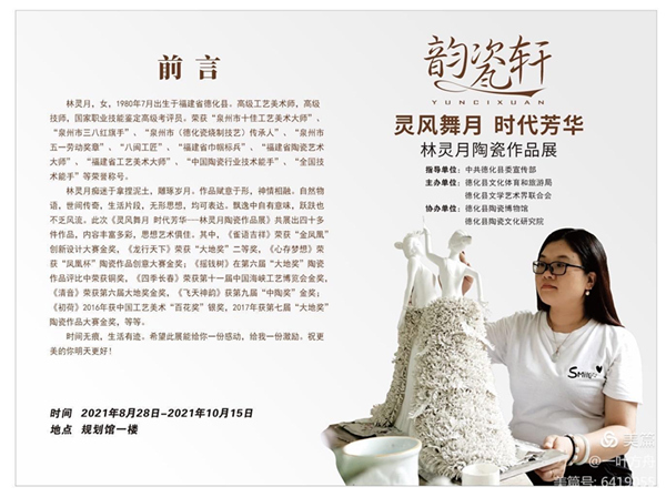 文章摘要:灵风舞月 时代芳华——林灵月陶瓷作品展2021年8月28日-10月15日在德化县城市规划馆一楼展出