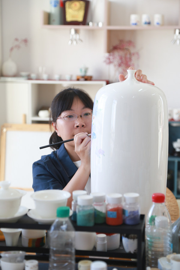回想起创作初期,由纸到瓷的介质转变,一时给曾云燕带来了不小的挑战。“釉上瓷面较为光滑,颜料附着力较弱,容易流动,不好控制。”曾云燕说。
