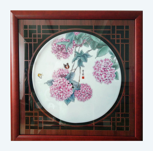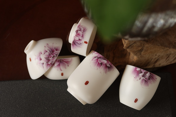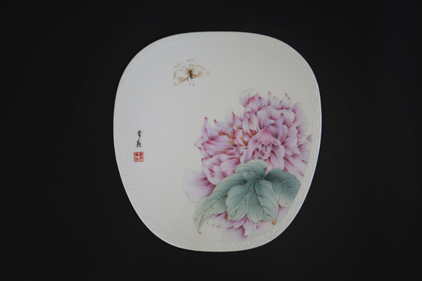 受传统国画专业的影响,曾云燕的瓷画作品主要以工笔花鸟、人物为主,以茶器、瓷瓶、瓷盘、瓷板等为绘画载体,擅长釉上作画,色彩清雅,画面布局讲究空间留白,这也是德化许多瓷画艺人不谋而合的观点。“留白可以将德化洁白纯净,温润剔透的瓷土特性展现出来。”曾云燕说。