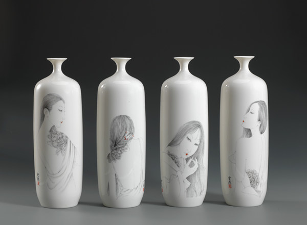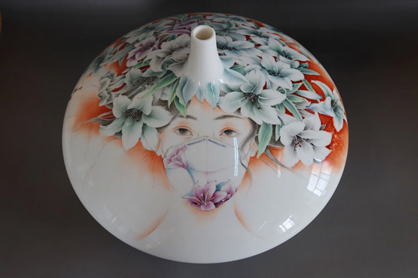 曾云燕是一位率性、洒脱的手艺人,创作全凭自己的喜恶。她时而在茶器上作画,百合、芙蓉、莲花、绣球等各式花卉,经其精心绘制,跃然瓷上,栩栩如生。时而又在瓷瓶或瓷板上作画,千娇百媚的古代仕女、装饰精美繁杂的戏曲花衫、圣洁无私的白衣天使……,风格不一,手法也不一。