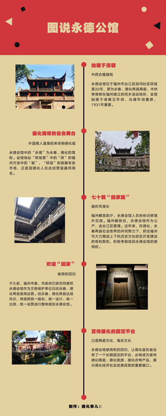 目前,永德会馆交给福州市永春和德化商会运营。今后,会馆将成为永春、德化在福州推介旅游资源,宣传历史文化,展示陶瓷、香醋等特色产品的重要窗口,预计世遗大会前可对外开放。