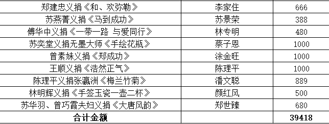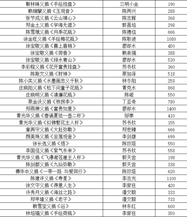 为弘扬“一方有难,八方支援“的大爱精神,助力新型冠状病毒肺炎疫情防控工作,由福建省陶瓷行业协会主办,德化县工商联(总商会)、德化县陶瓷发展委员会办公室协办,世界瓷都戴云山艺术馆承办的德化陶瓷艺术品第一期义卖活动顺利拉下帷幕。此次义卖(义捐)所得金额4.8184万元全数捐赠我县红十字会,现将义卖(义捐)名单公示如下!