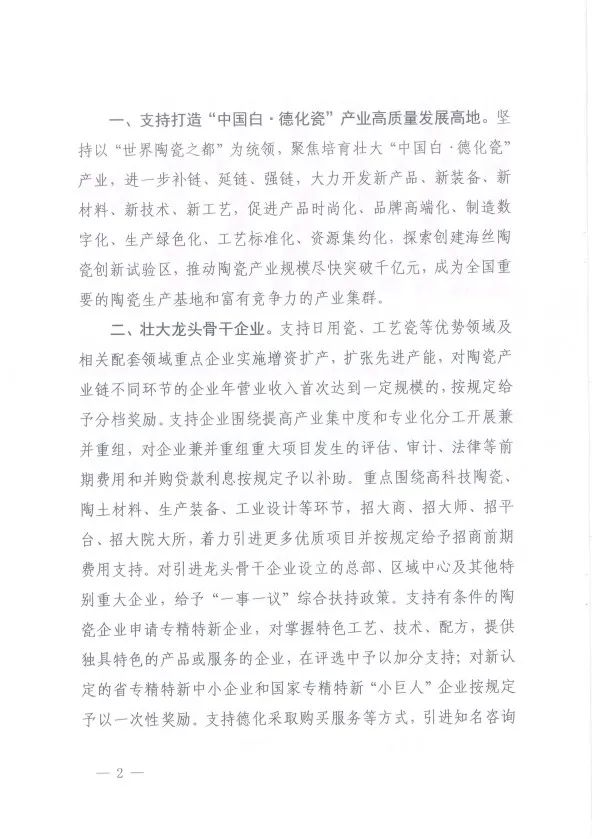 支持日用瓷、工艺瓷等优势领域及相关配套领域重点企业实施增资扩产,扩张先进产能,对陶瓷产业链不同环节的企业年营业收入首次达到一定规模的,按规定给予分档奖励。支持企业围绕提高产业集中度和专业化分工开展兼并重组,对企业兼并重组重大项目发生的评估、审计、法律等前期费用和并购贷款利息按规定予以补助。重点围绕高科技陶瓷、陶土材料、生产装备、工业设计等环节,招大商、招大师、招平台、招大院大所,着力引进更多优质项目并按规定给予招商前期费用支持。对引进龙头骨干企业设立的总部、区域中心及其他特别重大企业,给予“一事一议”综合扶持政策。支持有条件的陶瓷企业申请专精特新企业,对掌握特色工艺、技术、配方,提供独具特色的产品或服务的企业,在评选中予以加分支持;对新认定的省专精特新中小企业和国家专精特新“小巨人”企业按规定予以一次性奖励。支持德化采取购买服务等方式,引进知名咨询机构对陶瓷企业进行诊断,帮助企业转变观念,加快建立现代企业制度。