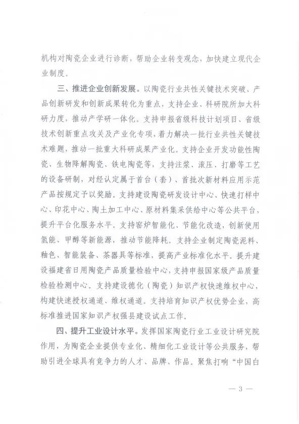 以陶瓷行业共性关键技术突破、产品创新研发和创新成果转化为重点,支持企业、科研院所加大科研力度,推动产学研一体化。支持申报省级科技计划项目、省级技术创新重点攻关及产业化专项,着力解决一批行业共性关键技术难题,推动一批重大科研成果产业化。支持企业开发功能性陶瓷、生物降解陶瓷、铁电陶瓷等,支持注浆、滚压、打磨等工艺的设备研制,对经认定属于首台(套)、首批次新材料应用示范产品按规定予以奖励。支持建设陶瓷研发设计中心、快速打样中心、印花中心、陶土加工中心、原材料集采供给中心等公共平台,提升平台化服务水平。支持窑炉智能化、节能化改造,创新使用氢能、甲醇等新能源,推动节能降耗。支持企业制定陶瓷泥料、釉色、智能装备、茶器具等标准,提高产业标准化水平。提升建设福建省日用陶瓷产品质量检验中心,支持申报国家级产品质量检验检测中心。支持建设德化(陶瓷)知识产权快速维权中心,构建快速授权通道、维权通道。支持培育知识产权优势企业,高标准推进国家知识产权强县建设试点工作。