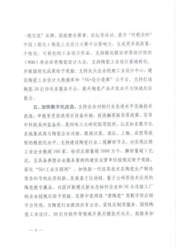 发挥国家陶瓷行业工业设计研究院作用,为陶瓷企业提供专业化、精细化工业设计等公共服务,帮助引进全球具有竞争力的人才、品牌、作品。聚焦打响“·德化瓷”品牌,鼓励整合赛事、论坛等活动,提升“何朝宗杯”中国(德化)陶瓷工业设计大赛平台影响力,生成更多高质量、个性化、可转化的工业设计作品。支持德化联合世界设计组织(WDO)举办世界陶瓷设计大会。支持陶瓷工业设计落地转化,并根据转化成果给予奖励。支持龙头企业创建工业设计中心,建设陶瓷工业设计大数据库和“5G+设计瓷都”云平台。支持打造陶瓷3D打印共享服务平台,提升陶瓷产品开发水平与快速反应能力。
