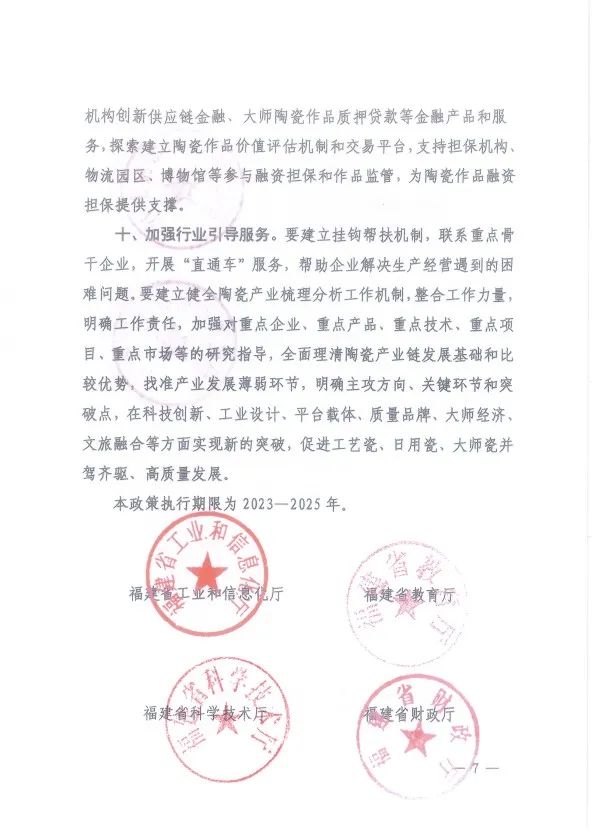 日前,省工信厅、省教育厅、省科技厅、省财政厅、省商务厅、省文旅厅、省市场监管局等七部门联合发文,出台支持“·德化瓷”产业高质量发展十条措施。
