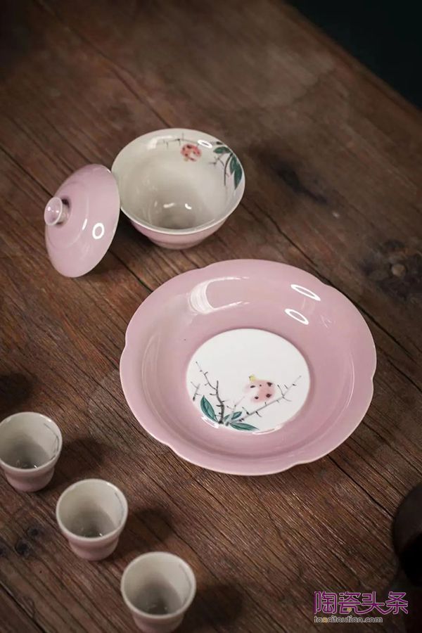 唐伯虎的蕉园套组、沈周的丹若套组、文征明的晴山碧川套装……,将苏园珍藏的经典名家名画入茶器,不仅提升了茶器的文化附加值,也让优秀的文化作品走入日常生活中,拉近名家名画与大众的距离,真正实现艺术生活化。值得一提的是,余丽萍的茶器用色较为大胆,粉色、红色、橙色、绿色等釉色,鲜艳出挑,但经余丽萍的处理之后便多了一份古味与雅趣。