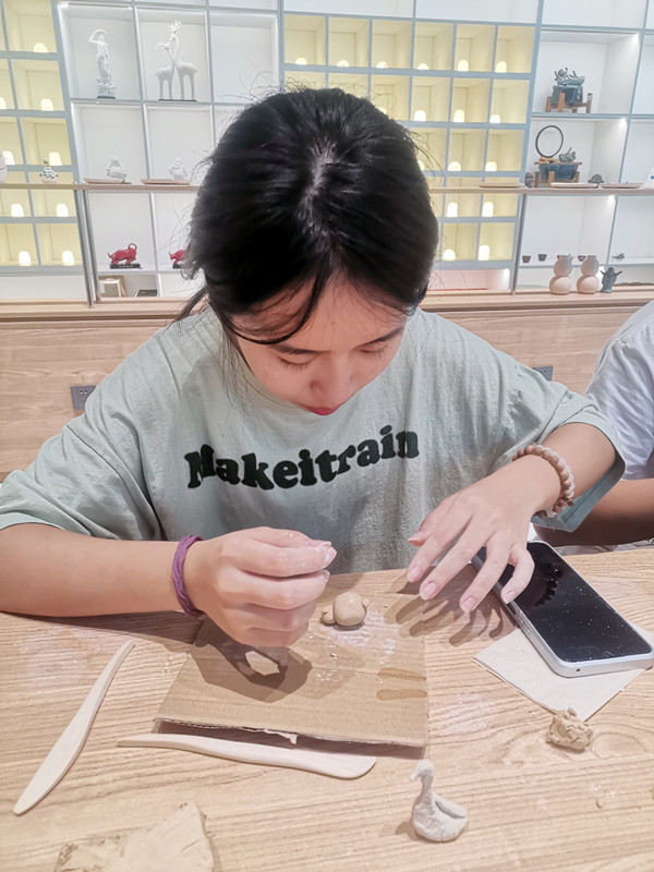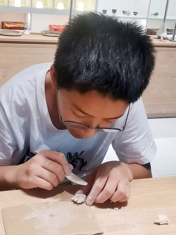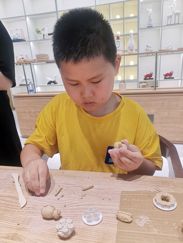 活动上,赖瑞攀老师从创作一件折枝梅花入手,演示德化陶瓷工艺,分享德化特色陶瓷文化,传播德化精湛的瓷塑工艺与洁白温润的白瓷文化,提升学生与家长对德化瓷的认知。在赖瑞攀老师的指导下,学生们围桌而坐,拿起泥巴,跟着老师学做雕塑,他们用泥巴创作出各式各样的泥塑作品,体验了一把泥土的乐趣。