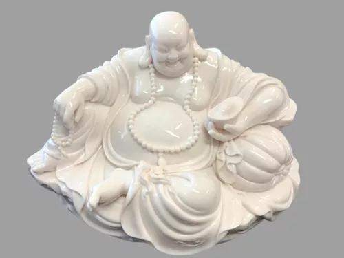 明代德化窑白瓷别具一格,宗教人物瓷塑更是德化窑最负盛名的产品。“孩儿红”弥勒佛承袭德化窑古法技艺,师法明代瓷雕大家何朝宗“何派”风格。刻画精细,五官细节丰富,头饱满,大耳垂,笑从容。形神兼备,衣纹深秀流畅,线条潇洒迷人,质地洁白、细腻如玉,高温作用下,胎体细密,透光度好。运用于“孩儿红”技艺,更显得白里透红,光亮照人,凸显了弥勒佛圣洁光辉,具有极高的艺术价值和观赏价值。