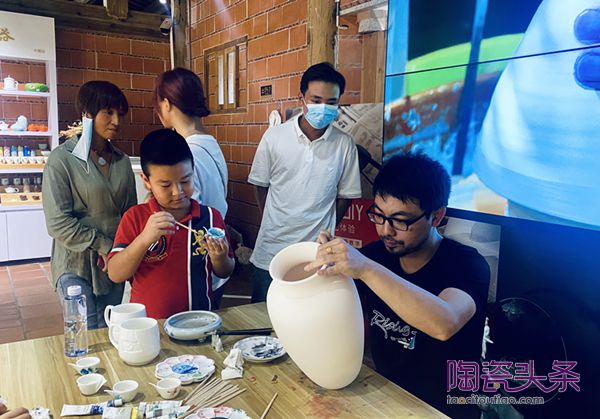 在创作体验上,庄晓阳老师现场在一件素坯瓷瓶上绘就了一幅山水画,寥寥数笔就已初显轮廓,展现出了精湛的画工技艺。他还不时与现场参与的小朋友互动,指导绘画技法。小朋友们天马行空,尽情发挥想象力,在陶瓷杯上作画,感受陶瓷手绘创作的乐趣。