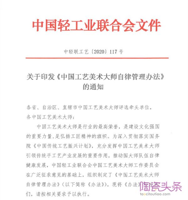 为深入贯彻落实国务院《中国传统工艺振兴计划》,充分发挥中国工艺美术大师引领传统手工艺产业发展的重要作用,推动国大师队伍自律健康发展。近日,中国轻工业联合会中国工艺美术大师工作委员会制定了《中国工艺美术大师自律管理办法》。