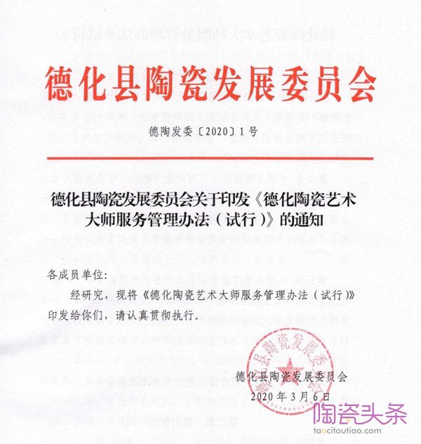 1.德化县陶瓷发展委员会关于印发《德化陶瓷艺术大师服务管理办法(试行)》的通知(德陶发委〔2020〕1号 ).pdf (点击下载文件)