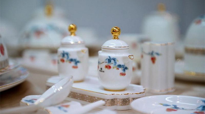 前来观展的马来西亚人王曼雯被一套“荔兴南国”宴会瓷具深深吸引——瓷器通体釉色温润、玉质肌理,器形设计上有许多中国文化元素,比如盖粒为浮雕绣球设计,花面采用荔枝,边饰汲取了广西的壮锦图案。