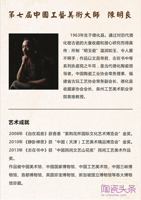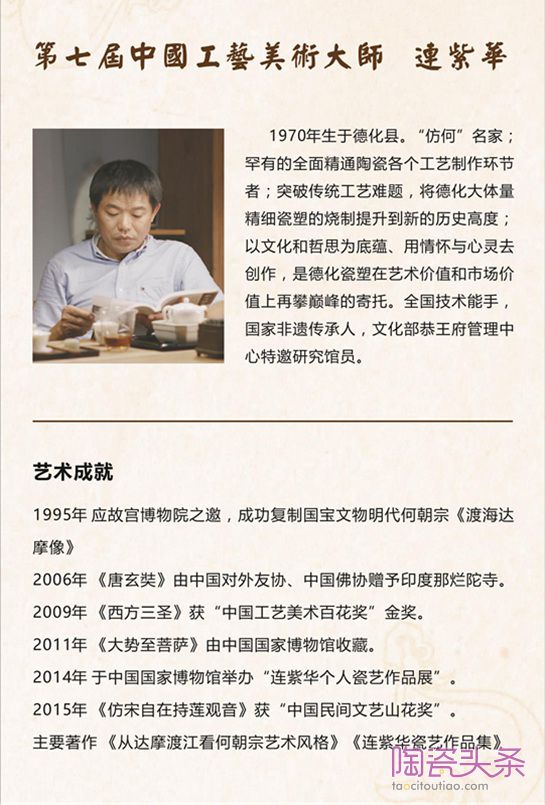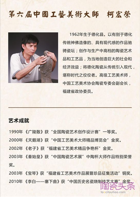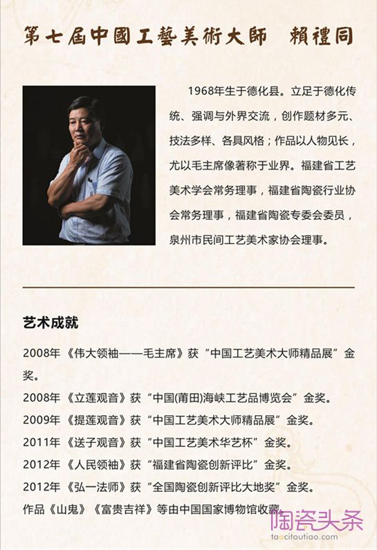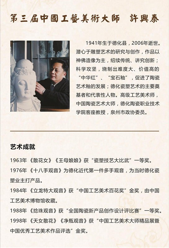 2020年,《八闽中国工艺美术大师全集》在原《八闽瑰宝——八闽中国工艺美术大师合集》基础上,润色补充,收录福建省全部49位国大师资料,其中德化获评中国工艺美术大师有6人,他们凭借着对工艺陶瓷精益求精的追求与坚守,成为引领一方的代表性人物。