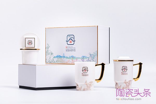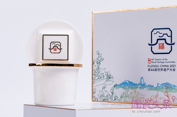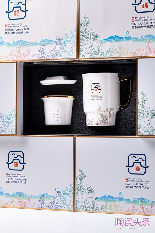 据三德陶瓷相关负责人介绍,《古厝映像马克杯》采用德化白瓷传统工艺制作,胎釉质感柔滑温润、如脂似玉,颜色洁白细腻、温雅脱俗。茶盖取型于福州古厝屋脊,茶漏镂空“44”,寓意第44届世界遗产大会与深厚特色的福州文化完美融合;茶杯主体上下镶制金边,以烫金工艺烧印福州古厝屋脊抽象图案,同时融入代表福州特色“福文化”的“福”字,祝福四海而来的贵客;杯身上的茉莉花含苞待放,仿若微风中摇曳,散发阵阵馨香,寓意来宾与福州文化的情缘一生莫离;茶杯的握把取型于中国“中”的一部分,凸显中华文化的博大精深。