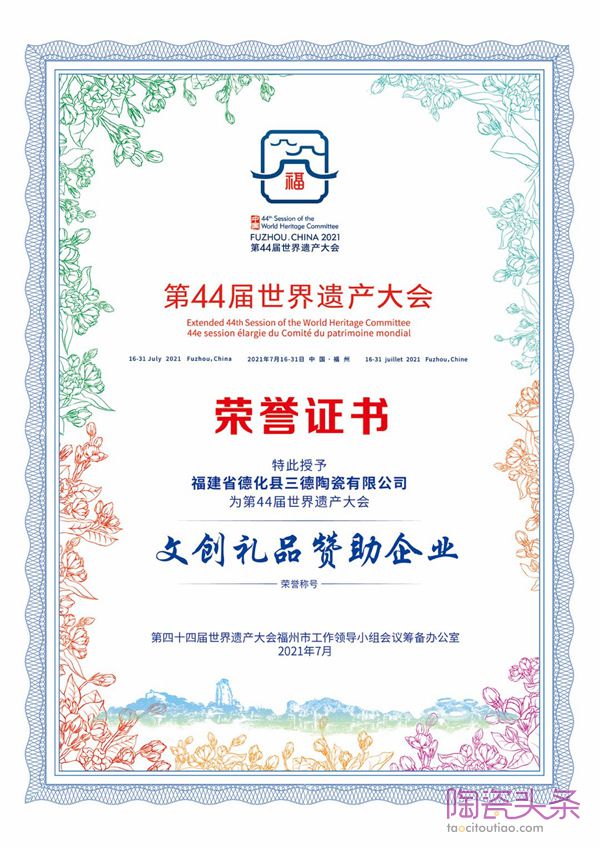 整件作品充分融合了陶瓷、古厝、花卉、汉字等文化,展现出了精湛的传统制作工艺与优秀的中国文化。三德陶瓷还被大会授予“文创礼品赞助企业”的荣誉称号,在世遗大会的舞台上留下了光辉的一笔。