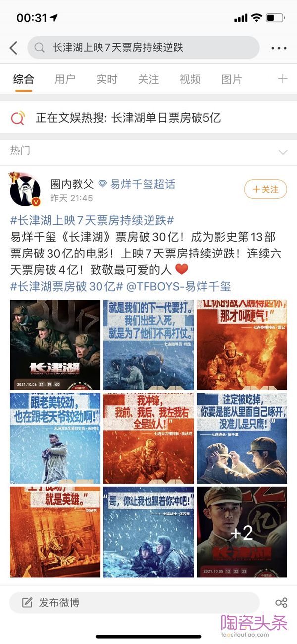上映11天,票房就破40亿,被网友评为值得二刷三刷的电影——《长津湖》位列中国影史票房榜第7位,成为国庆档票房冠军,微博热榜甚至用“逆跌”这个词来形容《长津湖》的票房。