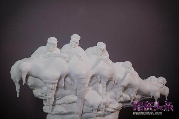 因此,刘钱以此为题材,创作了作品《长津湖—冰雕人》。他用德化瓷特有的白来展现那刺骨的冰霜,与一群英勇无畏,为国捐躯的英雄先烈,他们即使在零下40摄氏度阵地上,仍手握钢枪、手榴弹,保持着整齐队形和战斗姿态。同时作品融合了木雕与瓷雕的工艺技法,应用抽象与具象相结合的表达方式,没有其他多余的装饰语言,以最纯净的白来展现英雄先烈的光辉形象。