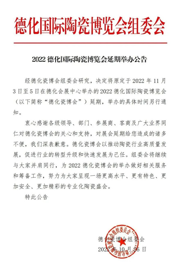 文章摘要:经德化瓷博会组委会研究,决定将原定于2022年11月3日至5日在德化会展中心举办的2022德化国际陶瓷博览会(以下简称“德化瓷博会”)延期,举办的具体时间另行通知。