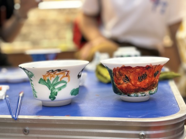 现场,曾燕宝老师,以德化白瓷为载体,亲身示范,在盖碗上手绘了一朵动人的牡丹花,并详细讲解了陶瓷手绘的技巧和要点,包括颜料的选择、笔触的运用、色彩的搭配等。她鼓励小朋友们发挥自己的想象力和创造力,绘制出属于自己的陶瓷作品。在曾老师的指导下,小朋友们纷纷拿起画笔,开始了自己的创作之旅。