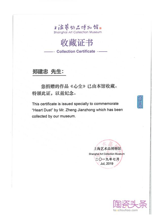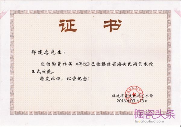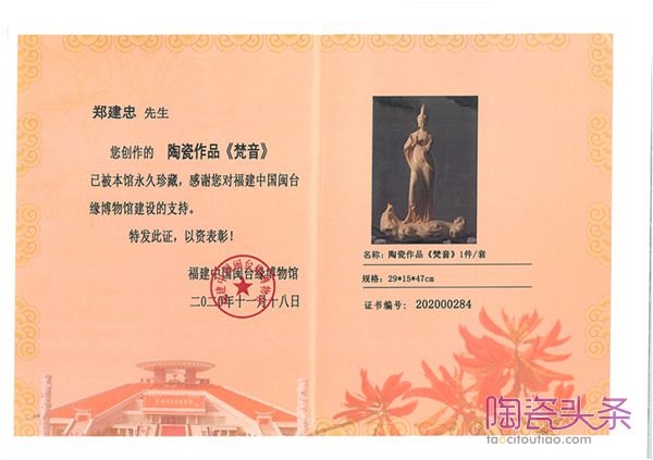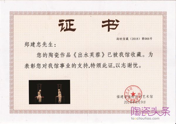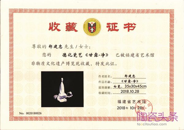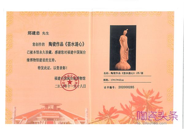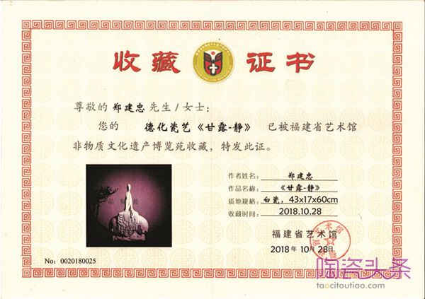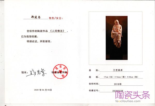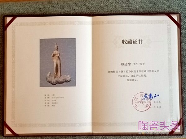据了解,中国美术馆是中国唯一的国家造型艺术博物馆,集展览、收藏、研究、公共教育、国际交流、艺术品修复、文创产业于一体,是中国美术最高殿堂。目前,馆中收藏的德化当代陶瓷艺术作品仍是少数。此次,郑建忠的陶瓷作品《静》被中国美术馆收入馆藏,这既是对郑建忠艺术构思与工艺技巧的高度肯定,也是对德化当代陶瓷艺术发展的高度认可。
