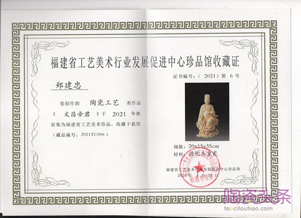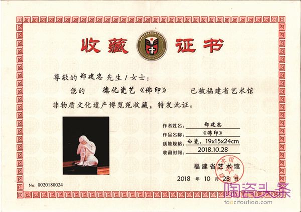 近日,福建省陶瓷艺术大师郑建忠瓷雕作品《静》被中国美术馆正式收藏。中国美术馆馆长吴为山对德化白瓷非常赞赏,充分肯定。