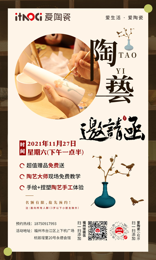 11月27日,中国白推广展示中心(福州馆)陶艺DIY活动邀您参与